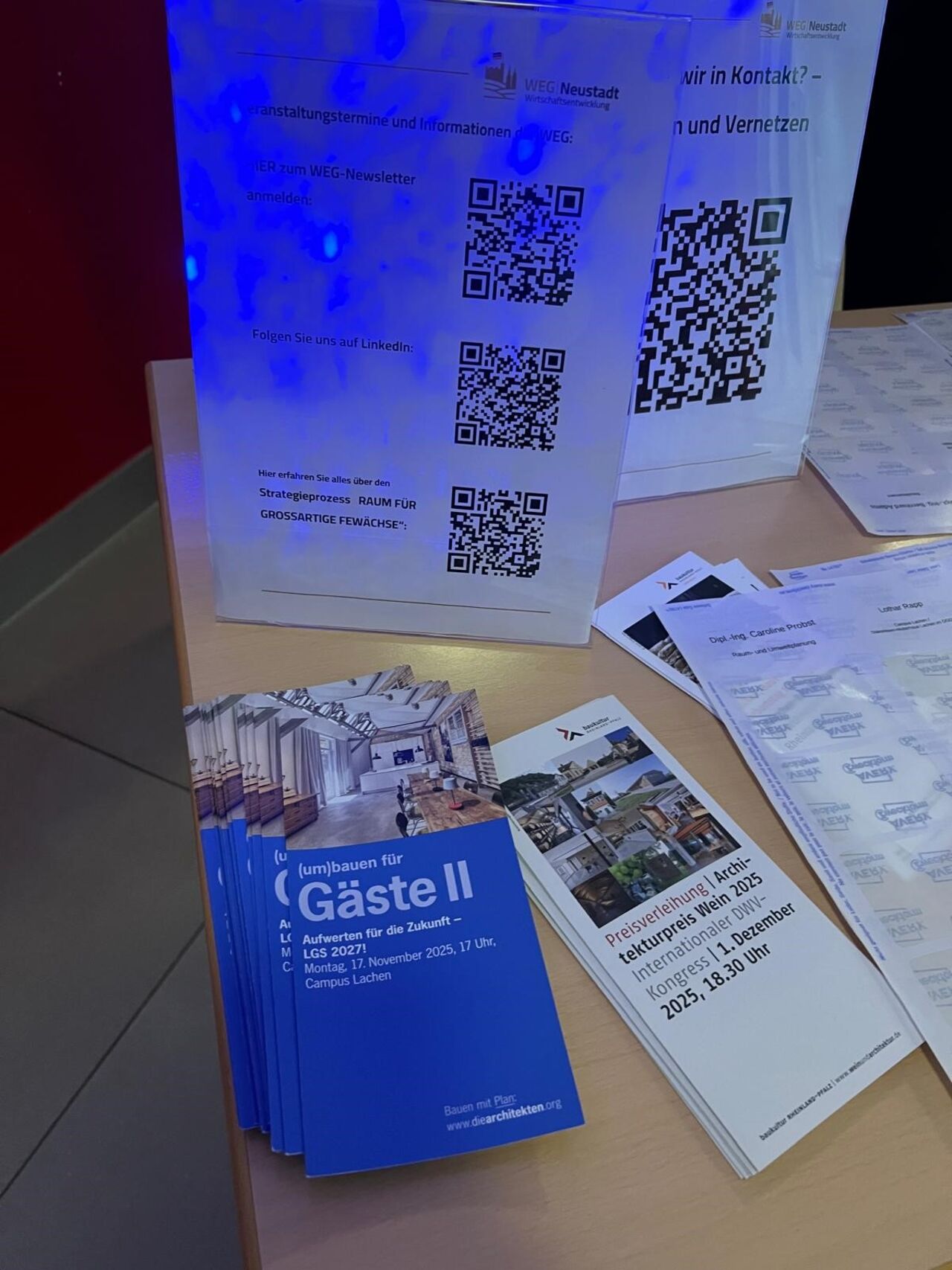 Am Montagabend den 17. November 2025 trafen sich rund 70 Gastronomen, Hoteliers und Architekten auf dem Campus Lachen in Neustadt. Die Architektenkammer Rheinland-Pfalz hatte gemeinsam mit der Wirtschaftsentwicklungsgesellschaft Neustadt zur Fachtagung "(um)bauen für Gäste II" geladen. Das Ziel war die Gastgeber der Region für die kommende Landesgartenschau 2027 fit zu machen. Eva Holdenried, Vorstandsmitglied der Architektenkammer, und Karin Henneke, Geschäftsführerin der Wirtschaftsentwicklungsgesellschaft führten durch den Abend.